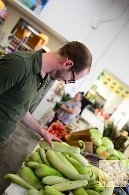 Here, our own Adam concentrates curiously at copious containers of chilis,