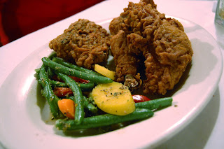 My half a chicken was served with a blend of veggies featuring beautiful string beans, seasoned with a bit of lemon-pepper. The chicken itself was blazing hot when it arrived, and was adorned with the most wonderful breading I've seen outside of Green Bay. "Fried Hard" was certainly the case: thin, well-seasoned, and CRUNCHY. The chicken itself was perfectly cooked, not overdone, but not borderline-pink, either. My only want was for a bit of salt to the chicken, which in hindsight I could have probably easily accomplished by picking up the salt shaker and using it for its intended purpose.