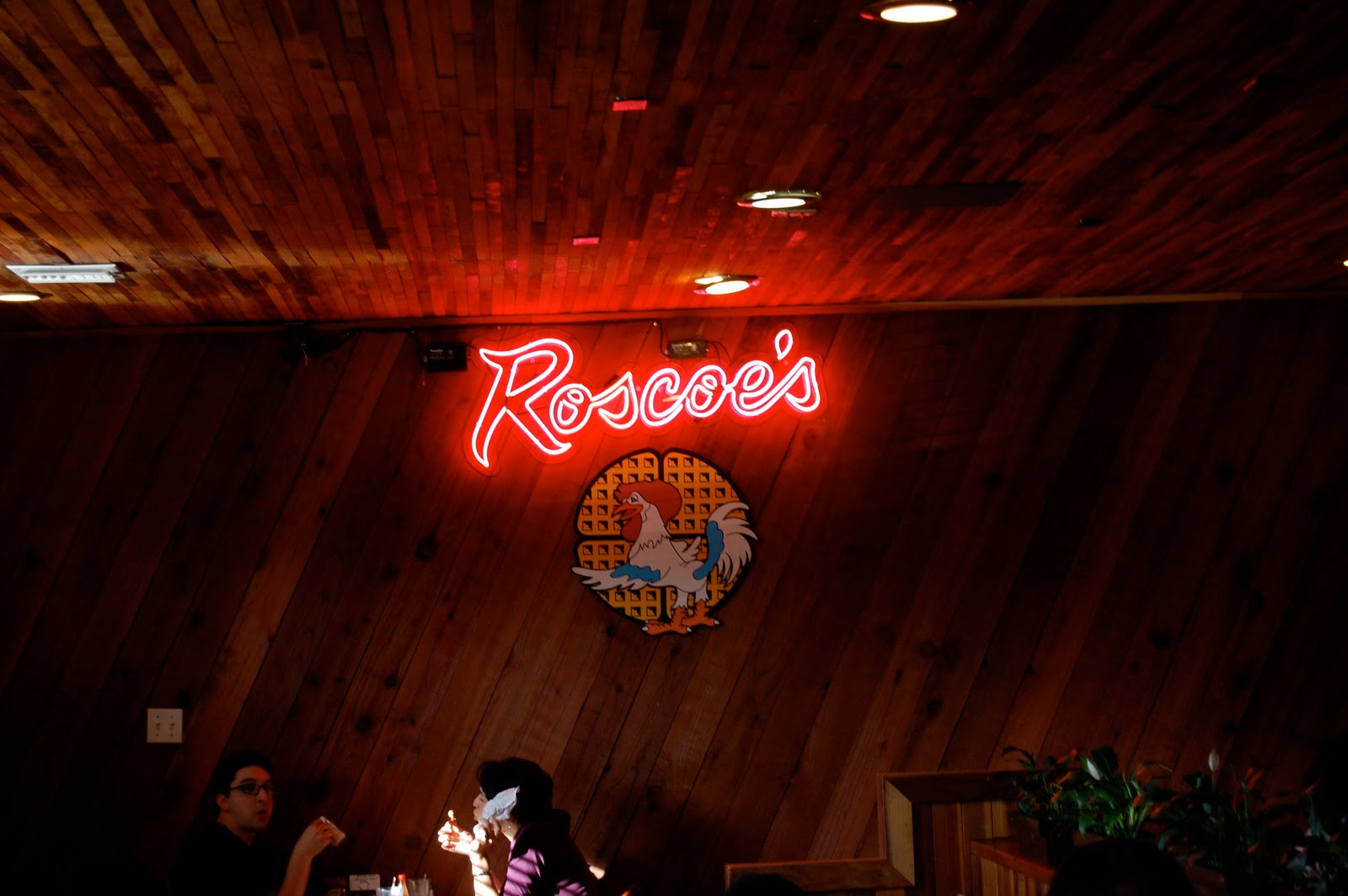 The inside of Roscoe's is how I imagine a lot of fried chicken restaurants looked... in the 70's. Rough-hewn wood panelling, careworn wood tables, lots of mirrors, and pink-tint floodlights in cans on the ceiling. Inside it was loud, big groups and families gathered around mounds of fried bird and cornbread. Signed pictures of celebrities bedecked the walls, and Kevin leaned over to me, "Supposedly this is Snoop Dogg's favorite place to eat..." Well, if it's good enough for Snoop Dogg, it's gotta be good for us!