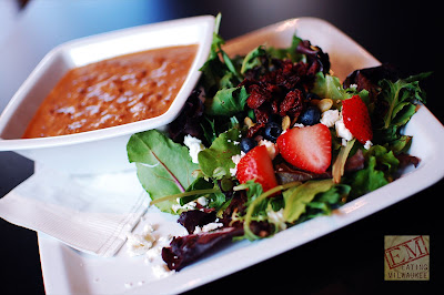 Next we examined the seasonal salad, served today with strawberries and blueberries over mixed greens, accompanied by the tomato walnut pesto soup, a piquant and intriguing concoction, indeed: