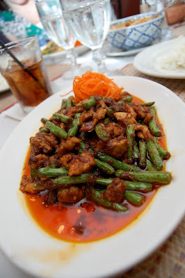 Andy's chicken with lime leaves and string beans was hot at spice level three, but not unbearable. Crazy flavors, salty, sweet, and hot, with each hunk of chicken coated in a sort of sauce-paste, and the whole conglomeration bathed in chili oil. Amazing.