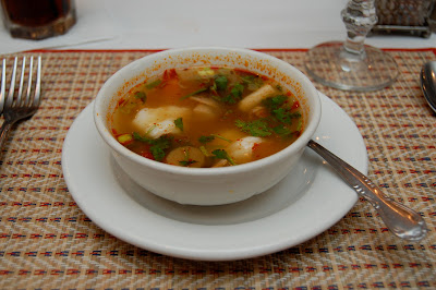 We also ordered soup... which actually came out before the appetizers. Andy had Tom Yum Goong, which is a spicy, clear hot and sour soup with shrimp: