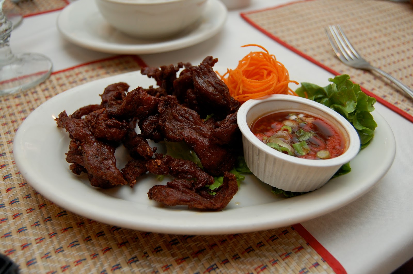Having already established the supremacy of Chicken Satay, we ordered some for an appetizer, as well as an order of Thai Beef Jerky, which we had become familiar with on our outing to the delightful Mekong Café.